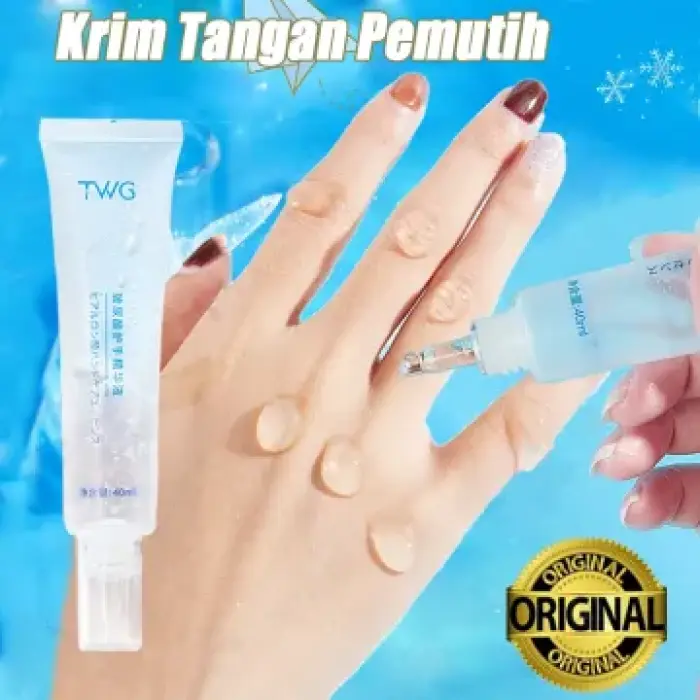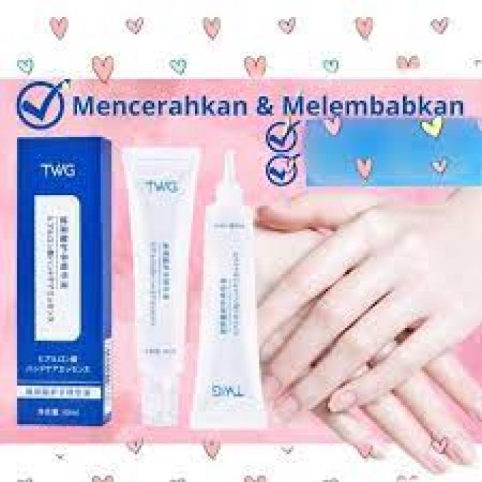 এই প্রোডাক্টটি হলো TWG Hyaluronic Acid Hand Care Essence। এটি মূলত হাতের ত্বকের যত্নের জন্য তৈরি একটি হ্যান্ড এসেন্স/ক্রিম, যা ত্বককে ময়েশ্চারাইজড, উজ্জ্বল ও মসৃণ করতে সাহায্য করে। ছবিতে "Sebelum" (আগে) এবং "Setelah" (পরে) লেখা অংশে ব্যবহার করার পরের পার্থক্য দেখানো হয়েছে।
