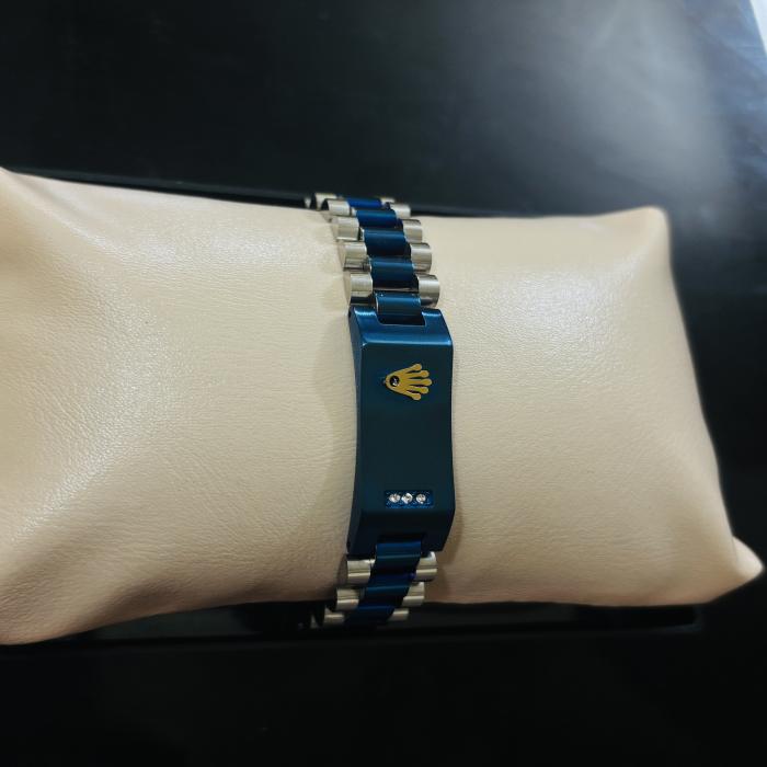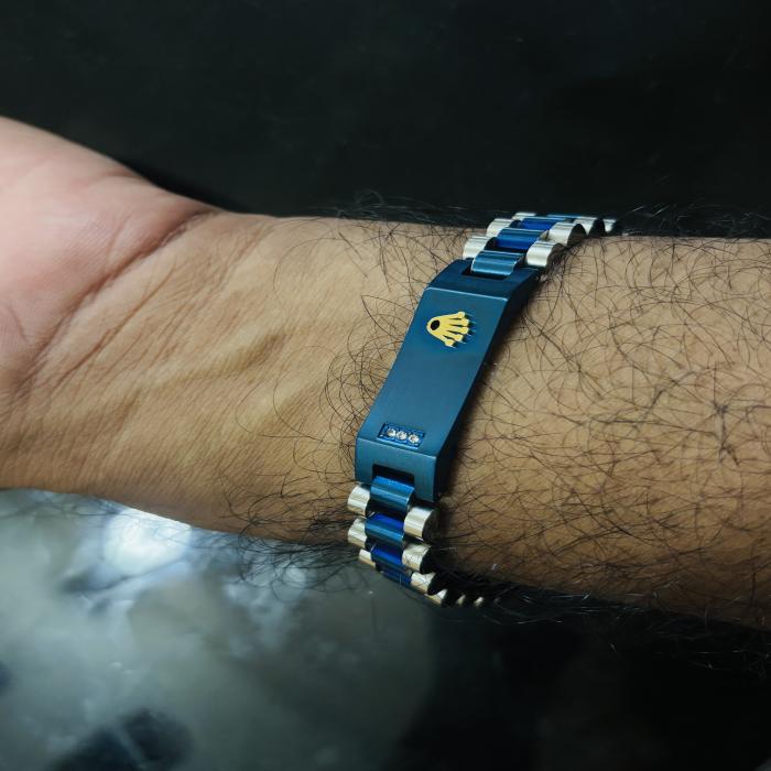 মেটাল লিংকের সিলভার-নীল কনট্রাস্ট ডিজাইন, সাথে আছে ক্রাউন লোগো – যা আপনার হাতের সাজে যোগ করবে এক্সক্লুসিভ লুক।