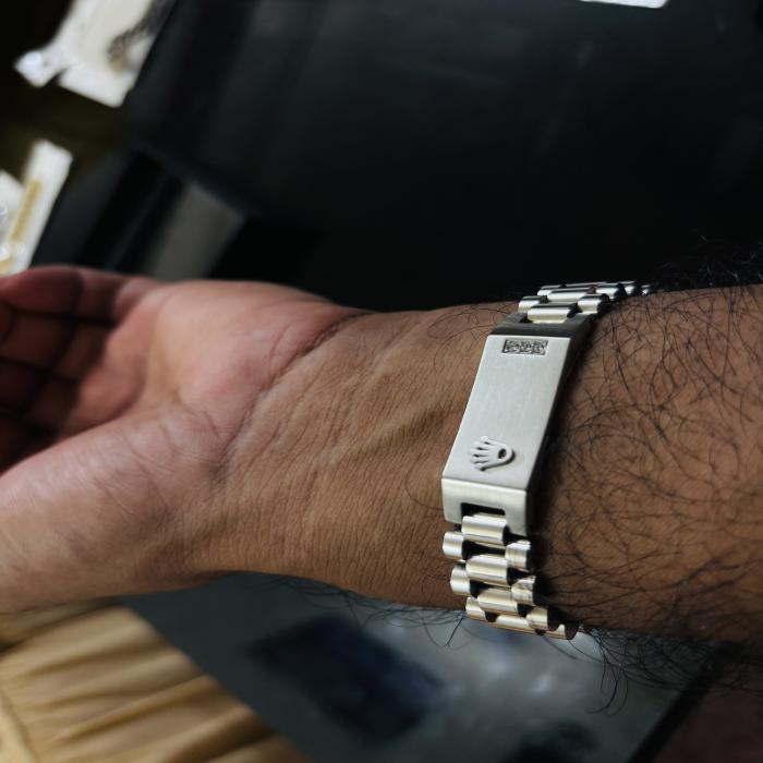 ক্লাসপ: কেন্দ্রীয় ক্লাসপ/লক প্লেট আছে, যেখানে স্পষ্টভাবে Rolex ক্রাউন লোগো খোদাই করা। ক্লাসপটি ফোল্ডিং/ডিপ্লয়মেন্ট টাইপ হতে পারে, যা সহজে লক ও আনলক করা যায়।